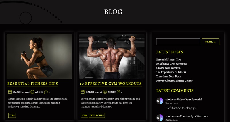 The Blog Page of the Fitness & Gym WDA is designed to help fitness professionals share valuable content, build authority, and engage their audience in a clean, modern, and highly readable layout.