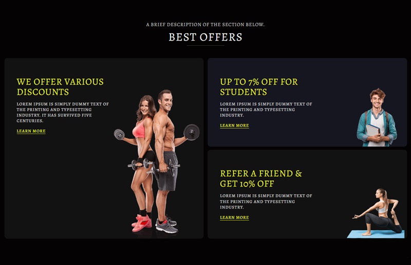 Every section & pattern of the WordPress Fitness & Gym theme is aligned with the goals of fitness brands. Trainer Profiles – Showcase your coaching staff with professional images and descriptions, helping build trust and personality on your site. Discounts & Promotions – Sections dedicated to promotional offers (like student discounts or referral bonuses) help you communicate value and attract new members.
