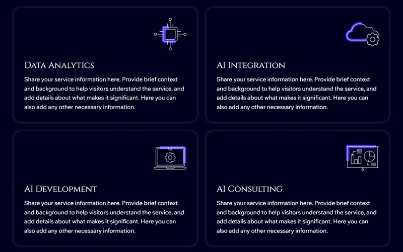 One of the standout aspects of the Wix AI website template is its comprehensive service presentation. It comes pre-configured with sections tailored to AI-related offerings, including Data Analytics, AI Integration, AI Development, Machine Learning, Natural Language Processing, AI Consulting, Prompt Engineering, and Workflow Automation.
