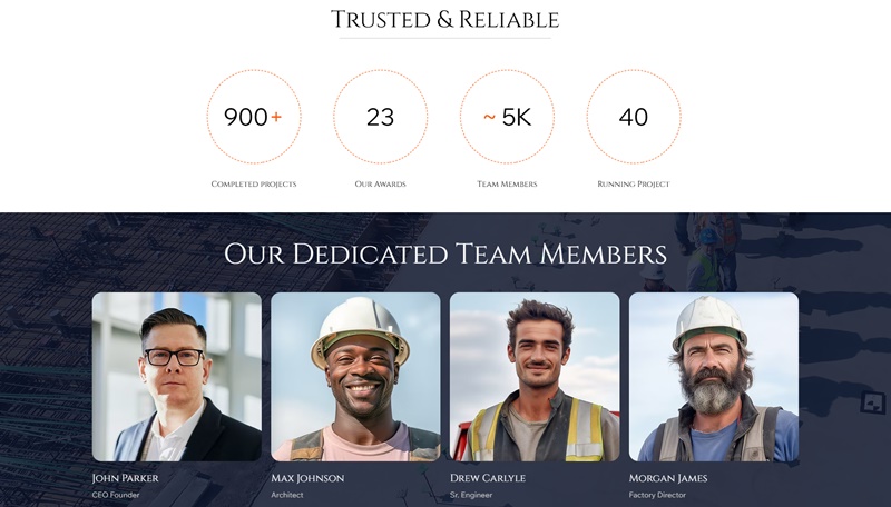 The About page also contains various sections. Here are the sections available for this page: Why Choose Us, Our Vision, Your Trusted Construction Partner, Achievements (Trusted & Reliable), Team Members, Our Experience, Testimonials, and Brands Working with Us.