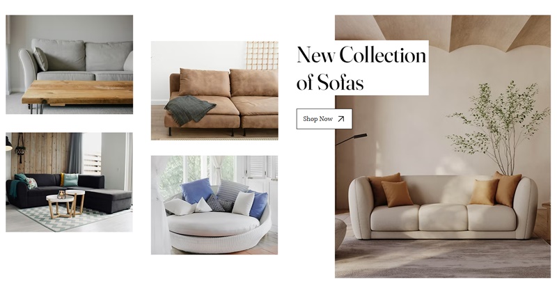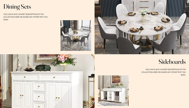 By default, we have added two sections with different designs: “New Bed Collection” and “New Sofa Collection”. After these two sections, there is another one in which the collections are presented differently, with names and descriptions (Dining Sets, Sideboards, Armchairs, and Home Office).