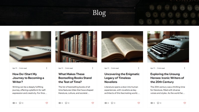 The Wix Writer & Author template delivers a clean, magazine-style blog feed. Perfect for sharing author insights, writing journeys, book recommendations, or sneak peeks.