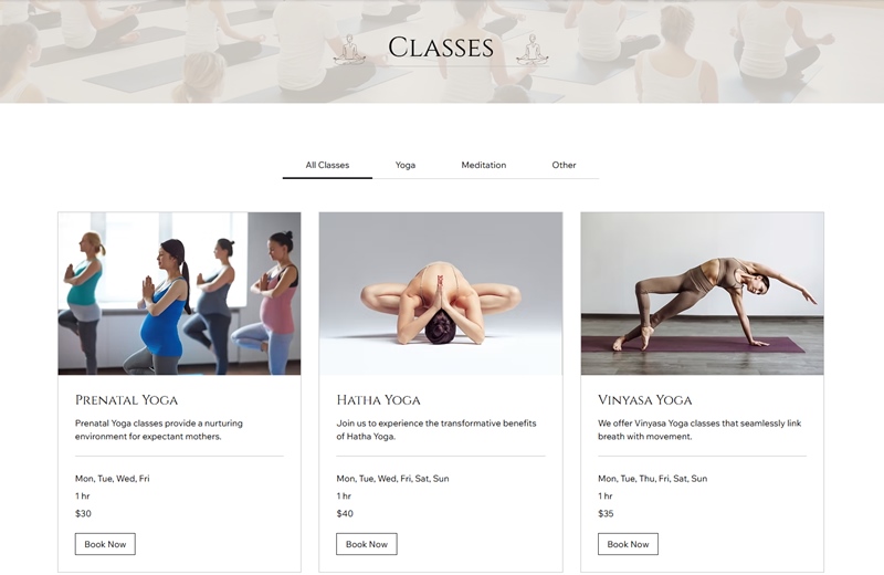 The Classes page of the Wix Yoga Studio template is thoughtfully organized to present your offerings with clarity and ease, helping visitors quickly find the sessions that suit their needs. Each class is showcased in a clean, structured layout with space for descriptions, prices, schedules, and other details, allowing potential clients to make informed choices at a glance.