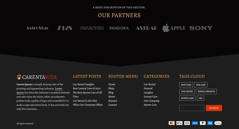 The WordPress Car Rental theme comes with various footer layouts and themes. You can change the footer options on the Theme Customization page > Footer section.