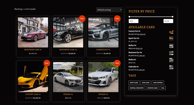 The product search bar is important for rental sites: users expect to be able to search by car categories or name/model. A good search bar simplifies this. Woocommerce breadcrumbs help users know where they are. The header cart design gives clarity and quick browsing.