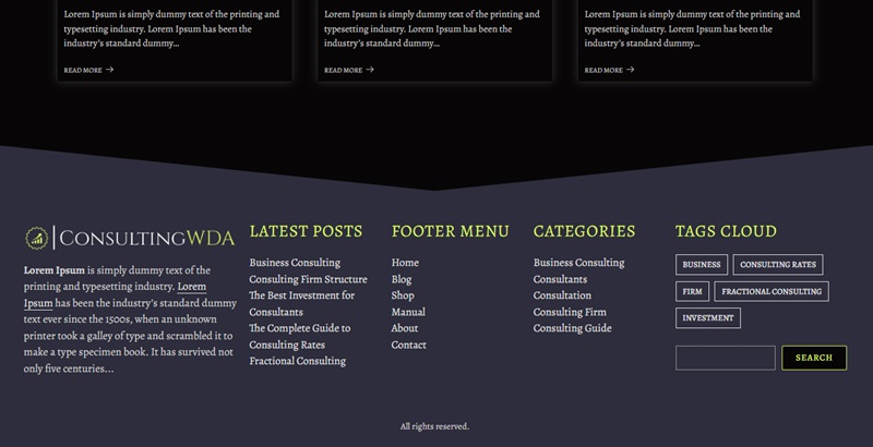 The footer section of the WordPress Consulting Services theme is fully customizable. This means you can choose from six available layouts, display the wave effect, and choose footer themes.