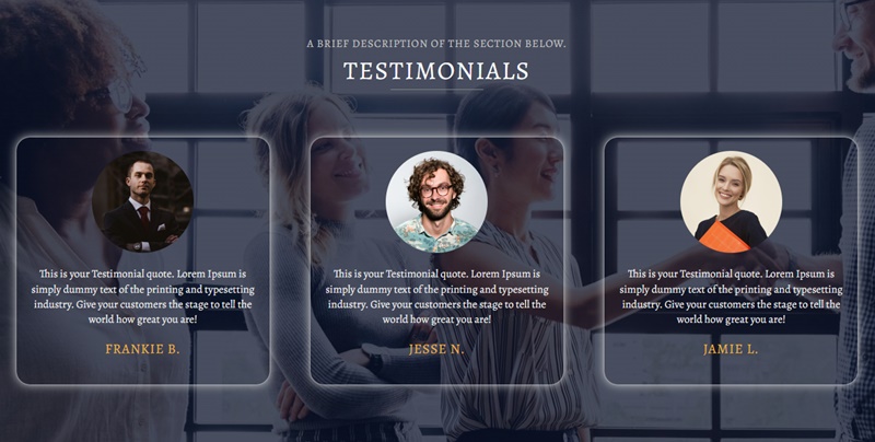 The testimonial section is fully customizable: you can change images, add visitors' names, and their reviews. The section includes a background image with a parallax effect. This gives the section a unique look and attracts the attention of your site visitors.
